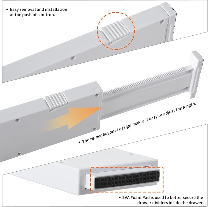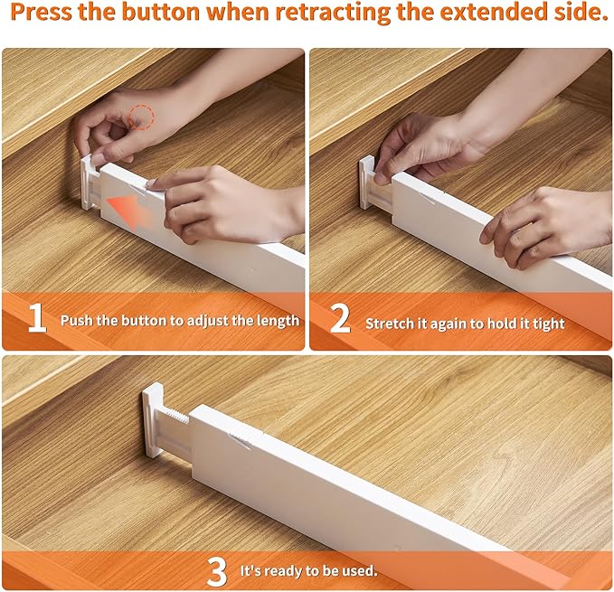 - Press the button on the top of the dresser dividers to straighten to the proper length. The anti-skid pads on both sides allow the drawer dividers for clothes to be better fixed in the drawer through strong friction and spring tension.