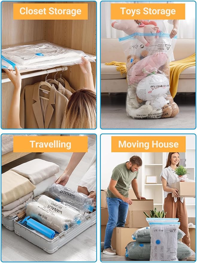 - 【Reduce Bag's Volume by 80%】Our vacuum storage bags are designed to help neatly organize your closet and store clothes, after using it, you can fell that your bedroom or apartment become a clutter-free and bigger zone, and able to pack more luggage into your suitcase when you travel, and use the thick and heavy duty polyester material, which can ensure you to use again and again and store the clothes for a long time