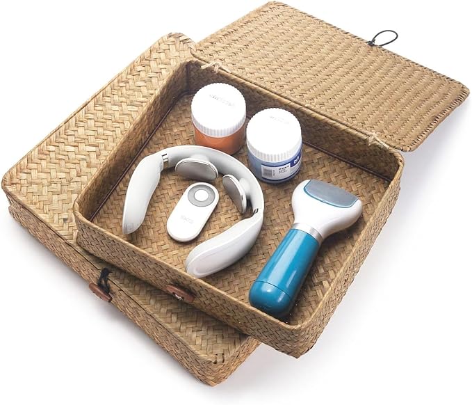 - Multi functional basket: The wicker storage bins can storage towels, socks, clothes, books, headphones, chargers, cosmetics, skincare products, chargers, charge cables, cards, letters, paper and other items. You can put them on shelf or table in living room, bedroom, bathroom.