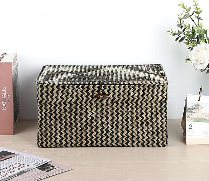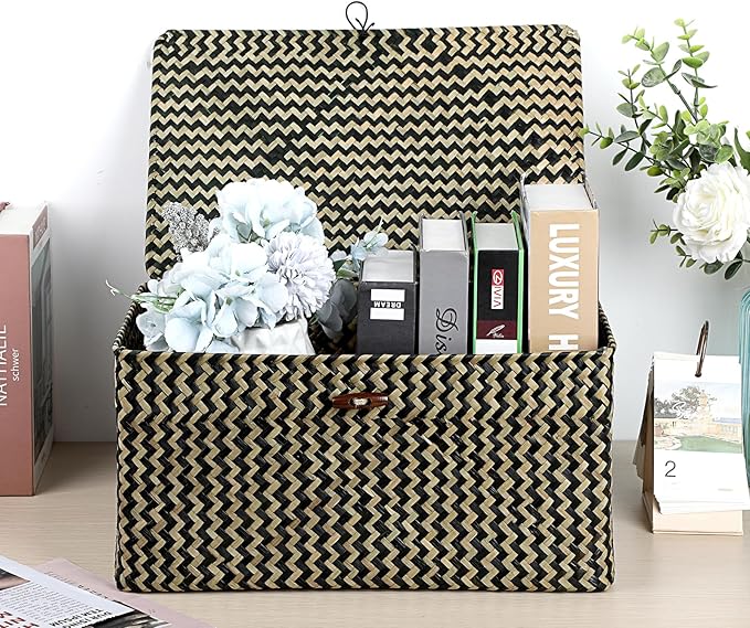 Hipiwe Wicker Shelf Baskets Bin with Lid, Handwoven Seagrass Basket Storage Bins Rectangular Household Basket Boxes for Shelf Wardrobe Home Organizer,Black,Large