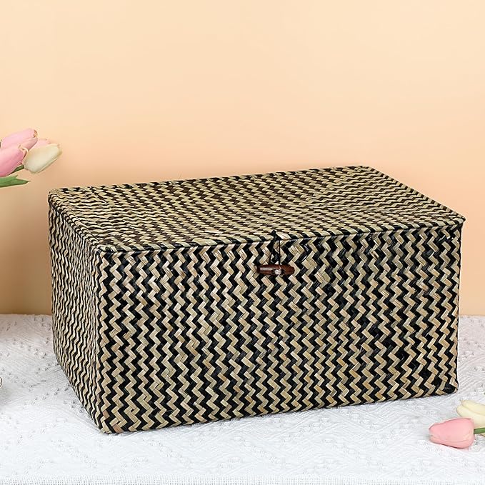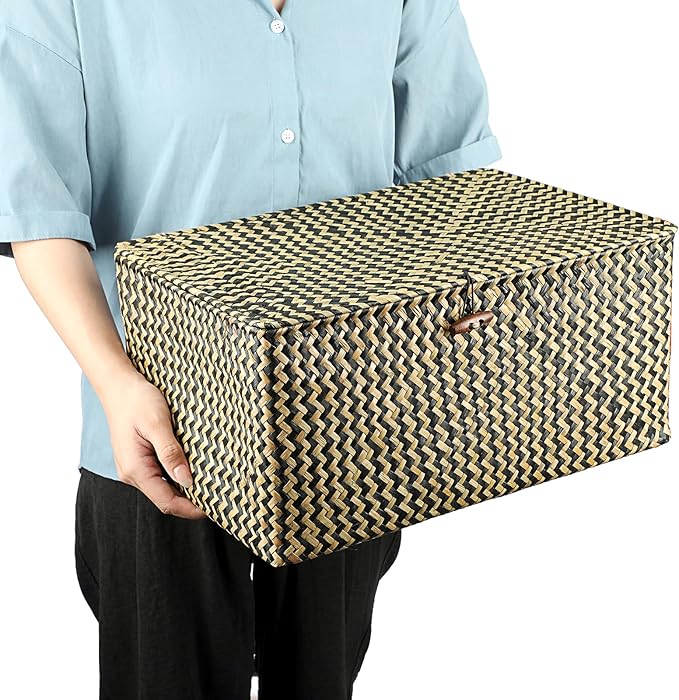 Hipiwe Wicker Shelf Baskets Bin with Lid, Handwoven Seagrass Basket Storage Bins Rectangular Household Basket Boxes for Shelf Wardrobe Home Organizer, Black,X-Large