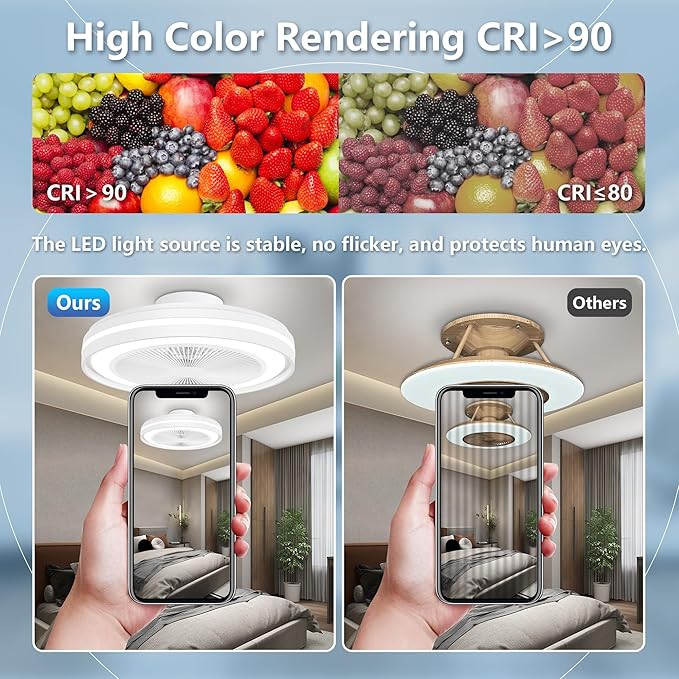- Dimmable RGB Light Colors: Smart low profile ceiling fan with millions of RGB colors to choose whatever you want.It also includes ambient light settings like night light, RGB mood lighting, and RGB cycle mode. Intelligent LED light source can support (2700K warm light to 6500K daylight adjustment). In addition, the brightness can also be adjusted.