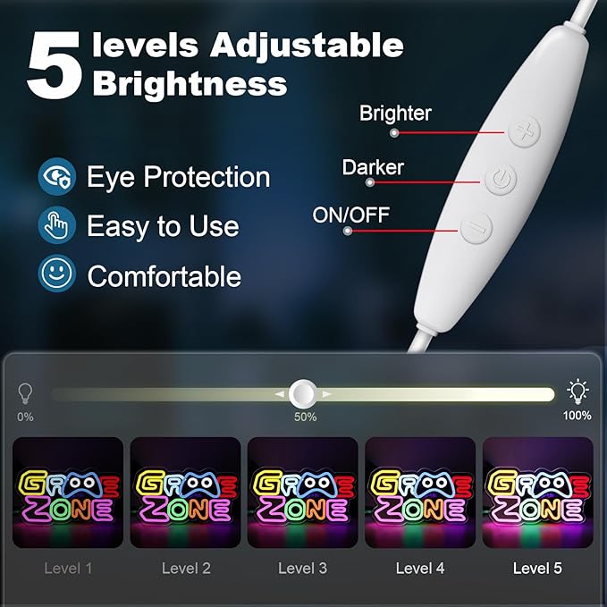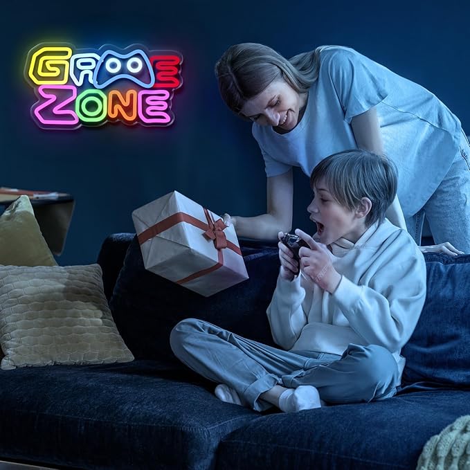 - 🎮【Colorful Game Zone Neon Sign】Easily make your gaming cave the coolest gaming base with this Game Zone neon sign, instantly transforms your game room level and bring a vigour. With improved realism and brighter, this LED Gamer neon sign sets the perfect mood for play. Colorful and safe, perfect for game room & teen boy room decor!