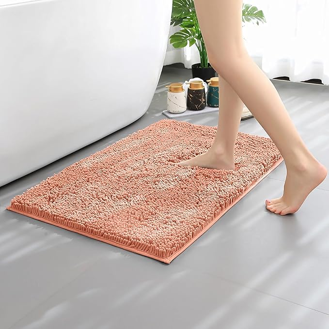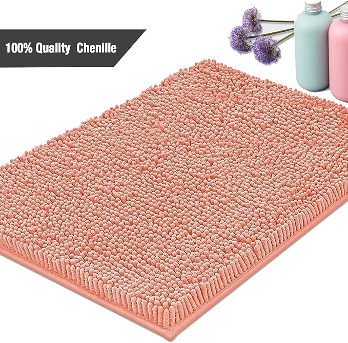 - SOFT CHENILLE: This bathroom rug is made of high-quality chenille. The chenille is viry soft and it's easy to clean. Chenille velvet length 1.5inch.Its color is more similar to that of an light orange peel, making it quite suitable for warm-toned decoration styles.Colors may show color differences in different environments. The first picture has been color-calibrated with a Mac computer and is the closest to the original color.