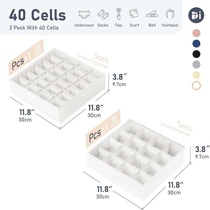 - 【Dresser Drawer Organizers Fits Various Items】24+16 Cells Underwear Organizer 11.81 x 11.81 x 3.54 in, great size to make your socks fit well. One has 24 cells, One 16 has cell enough to organize your gadgets and your families'items by color and style.