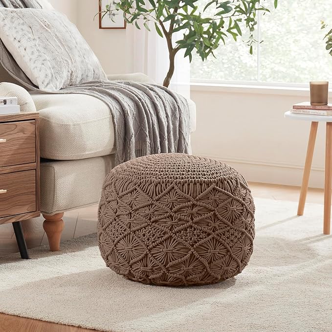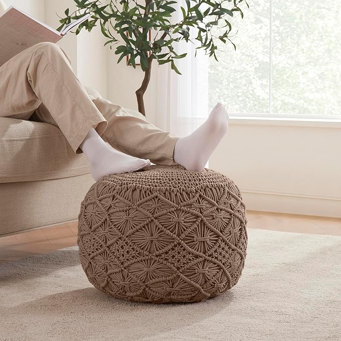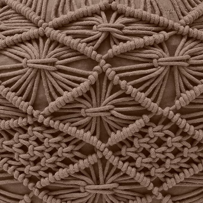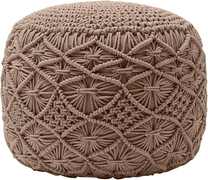 Ornavo Home Pouf Ottoman Foot Rest - 100% Cotton Pouffe - Hand Knitted Macrame Braid - Boho Round Stuffed Ottoman for Living Room, Bedroom - Taupe/Brown