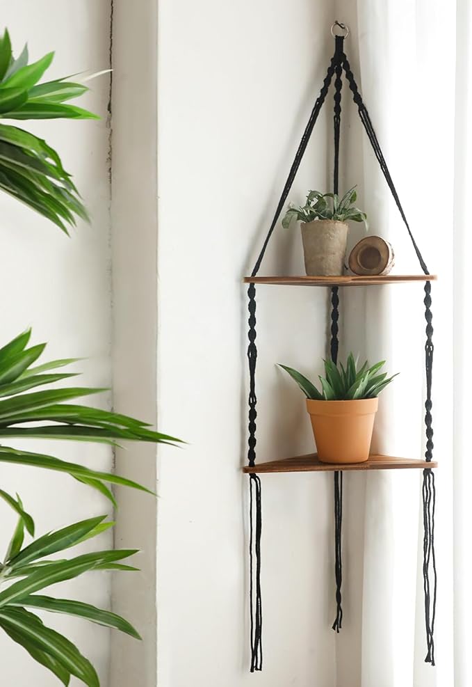 - CORNER WALL DECOR- Are you concerned about for kids or puppies to knock over plant pots? This 2 tier shelves will solve the problem. The Bohemian decor brings a chic vibe to your living room, bedroom, bathroom, nursery and dorm etc. The wooden hanging shelves are the perfect piece for any rustic, modern, or natural home decor