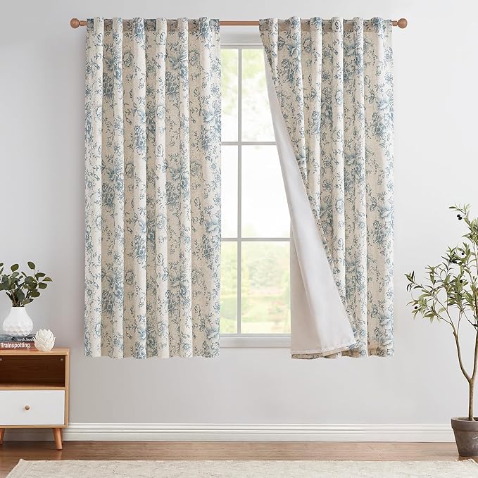 jinchan Lined Linen Blend Curtain Floral Curtains for Living Room 63 Inch Length Blue Peony Flower Printed Curtain Rod Pocket Back Tab Farmhouse Patterned Drapes Bedroom Window Curtains Set 2 Panels