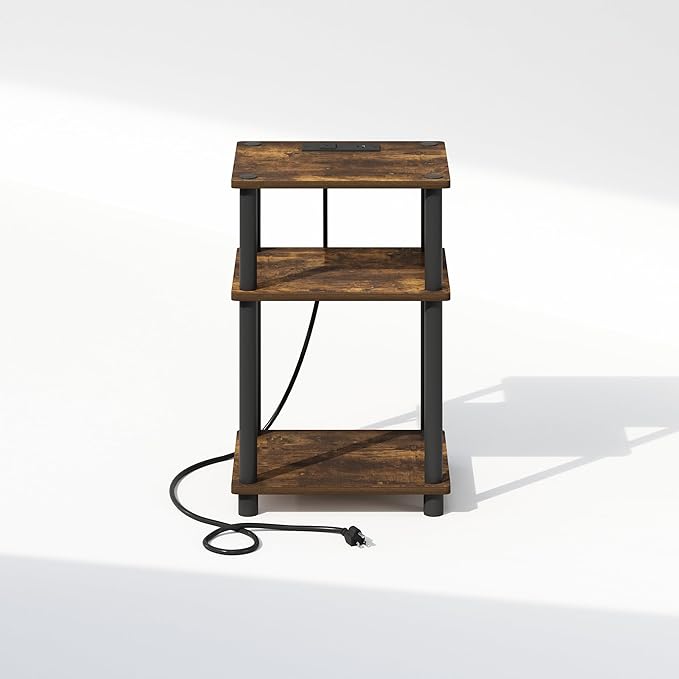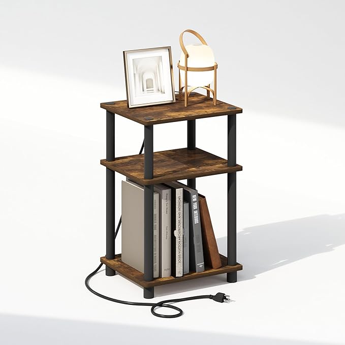 Furinno Just 3-Tier Turn-N-Tube Open Storage Nighstand, Bedside Table with USB and Type-C Charging Station, Amber Pine/Black