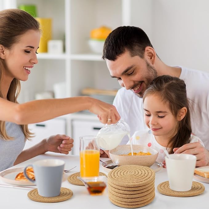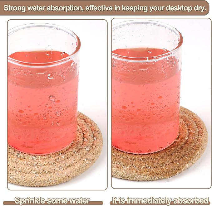 - 【High Quality】Drink coasters made from 100% cotton and linen. Not only do woven cup coasters are also well insulated, but cotton coasters prevent your countertops from getting covered with water stains to keep tabletops dry and clean, and more absorbent than other silicone or ceramic coasters to protect your tabletop/countertops/bar tops/furniture from being damaged by hot beverages.