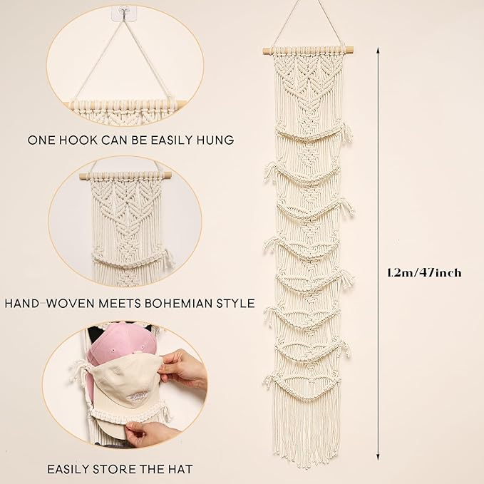 - Versatile & Multi-Purpose:This hat storage rack is ideal for displaying your hats while doubling as a unique boho wall decoration. It's perfect for bedrooms, closets, nurseries, or any space where you want to add texture and interest, creating a relaxed, rustic vibe.