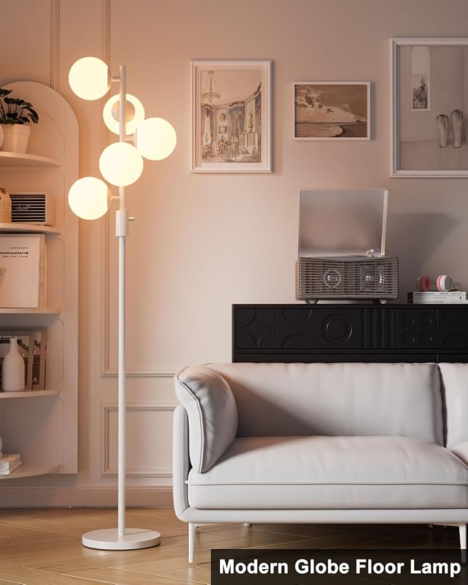 64IN Dimmable White Floor Lamp, Tall Standing Lamps with 5 Globe Soft Warm White Eye Care 3000K G9 Bulbs, Mid Century Modern Floor Lamp for Living Room Bedroom Office