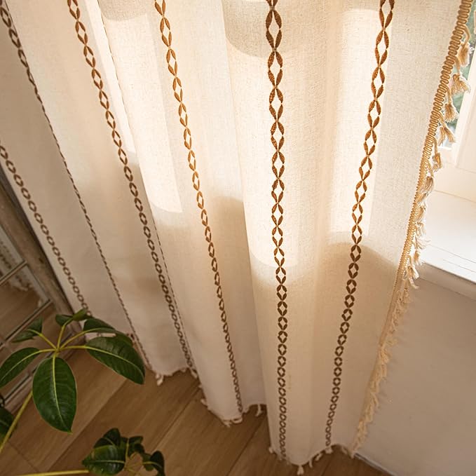 Sutuo Home Boho Curtains for Bedroom Living Room 96 Inches Long, Bohemian Drape Privacy Country Rustic Semi Blackout Farmhouse for House Decor Rod Pocket, 1 Panel W52 x L96 White and Coffee