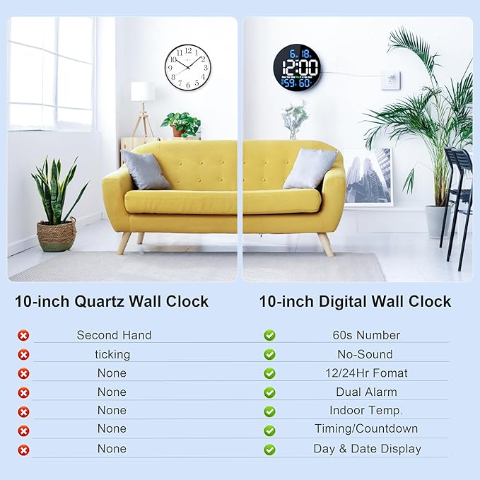 - Digital wall clock Dual Alarm Clock: Begin your days with the morning chime during weekdays, or another time weekend tone with a digital wall clock. This dual alarm clock helps keep your routine smooth, ensuring you're always tuned in to what matters with a digital wall clock.