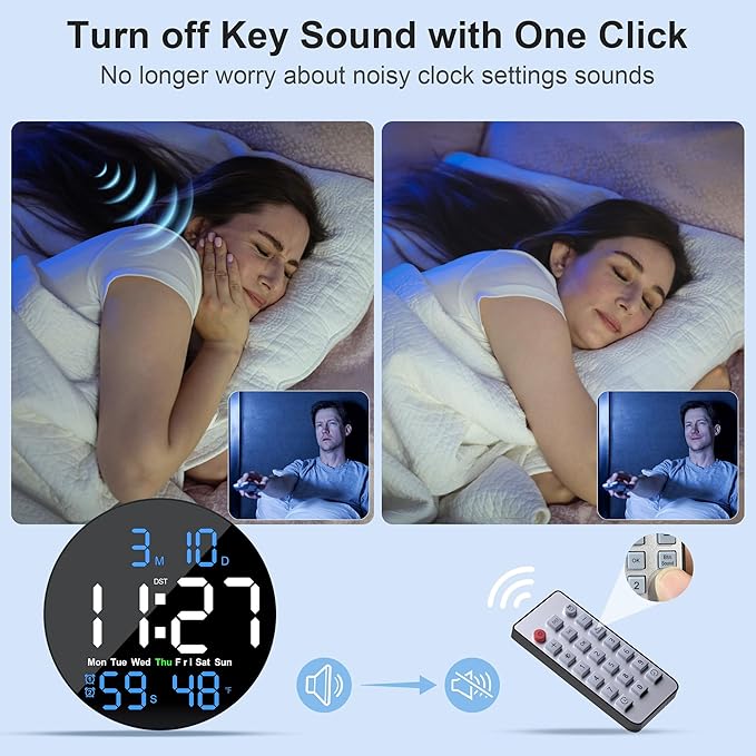 - Wall Clock for Bedroom Enjoy peace and quiet: With the ability to mute button sounds, it allows you to set or adjust the clock without disturbing others, making silent wall clocks nice for late-night adjustments or quiet environments to the setting.