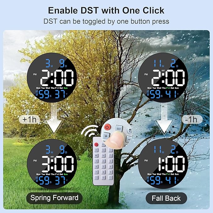 - Experience hassle-free time management: One-touch daylight saving with an office wall clock. Simplify your life with a single button press. No more fussing with time changes – just one tap and large wall clocks for living room decor automatically adjust to daylight saving time, keeping you in sync with the local.