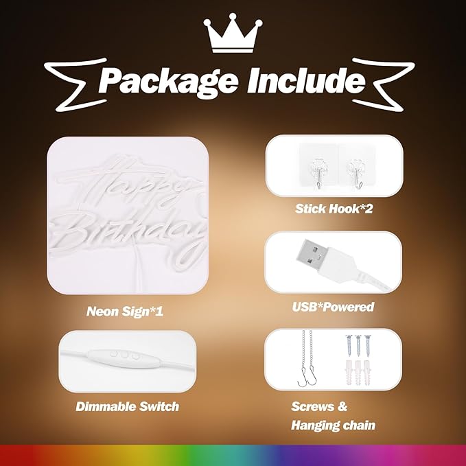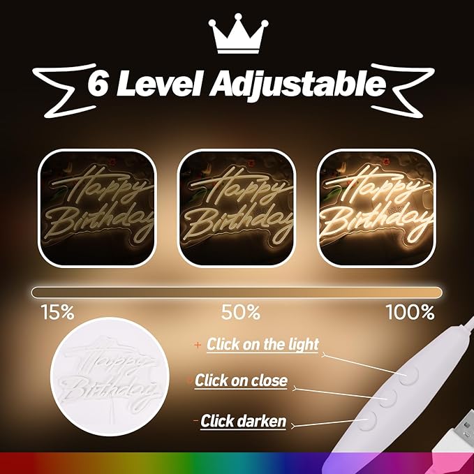 - Bright Birthday Decoration: The Happy Birthday neon sign is suitable for anyone's birthday decoration light. Celebrate this important day with this warm white Happy Birthday LED sign, providing a better birthday atmosphere for your birthday party or gathering. The dimmable design allows for the selection of appropriate lighting brightness based on the scene