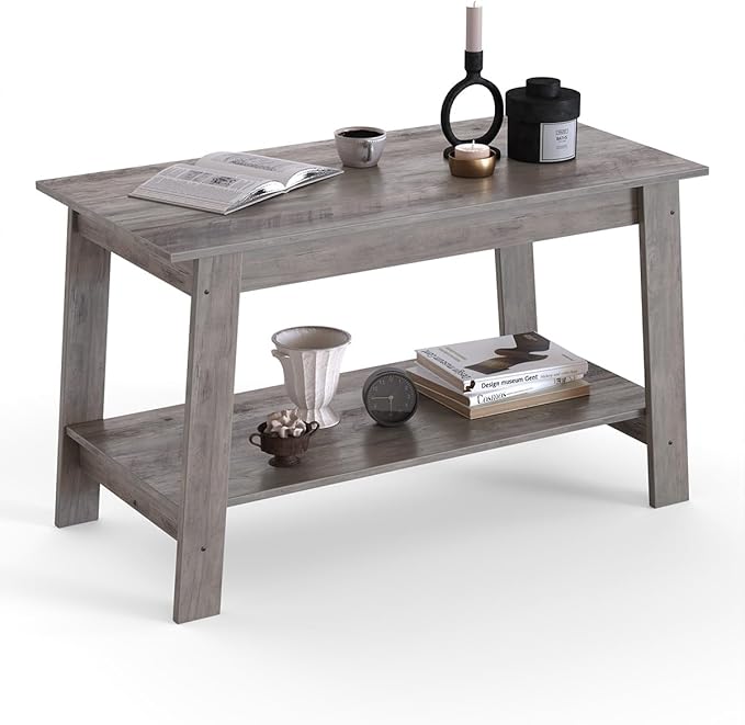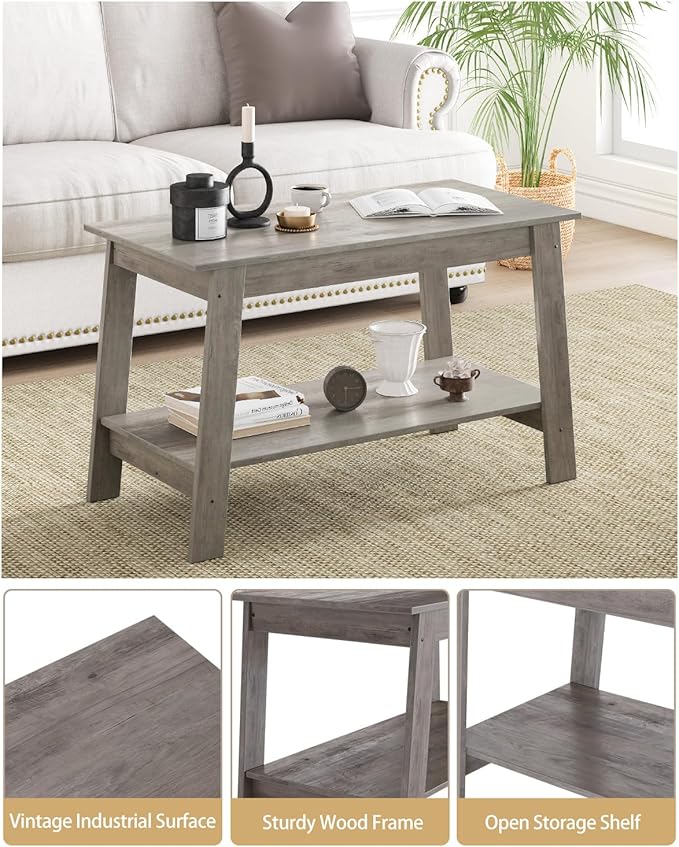 2-Tie Coffee Table, Rustic Wood Living Room Tables with Open Rectangular Storage Compartment, Coffee Tables for Living Room, Outdoors, Home Office, Bedroom, Grey