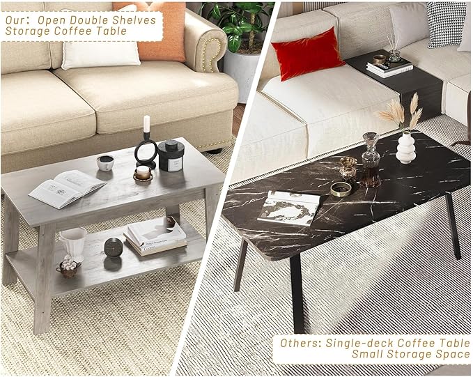 - Versatile Dual-Tier Storage Solution: Elevate your organization and display options with this coffee table's two-tier structure. The open rectangular storage compartment effortlessly accommodates storage bins, plant arrangements, an array of books, and other necessities . It's designed to keep your belongings within reach while maintaining a clutter-free and inviting atmosphere.