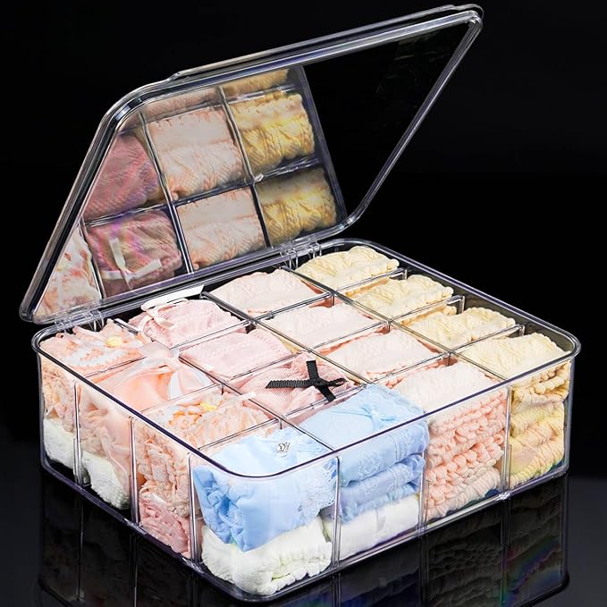 Sock Underwear Organizer, 16 Compartment Adjustable Dividers Bras Socks Underwear Drawer Organizers for Closet, Clear Plastic Storage Containers Box with Lids for Ties Bra Scarf Socks