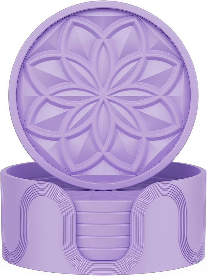 - Protect Furniture & Anti-Slip Design: Double-sided design, available on both sides. A unique flower pattern on one side and a simple circular pattern on the other. The grooved pattern holds liquid to prevent leaking, raised ripple promotes air flow to prevent the cup coaster from sticking to glassware. The unique design of the high non-slip surface ensures excellent table grip, protects the tabletop, and effectively prevents the cup from slipping and breaking