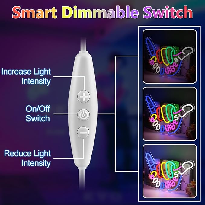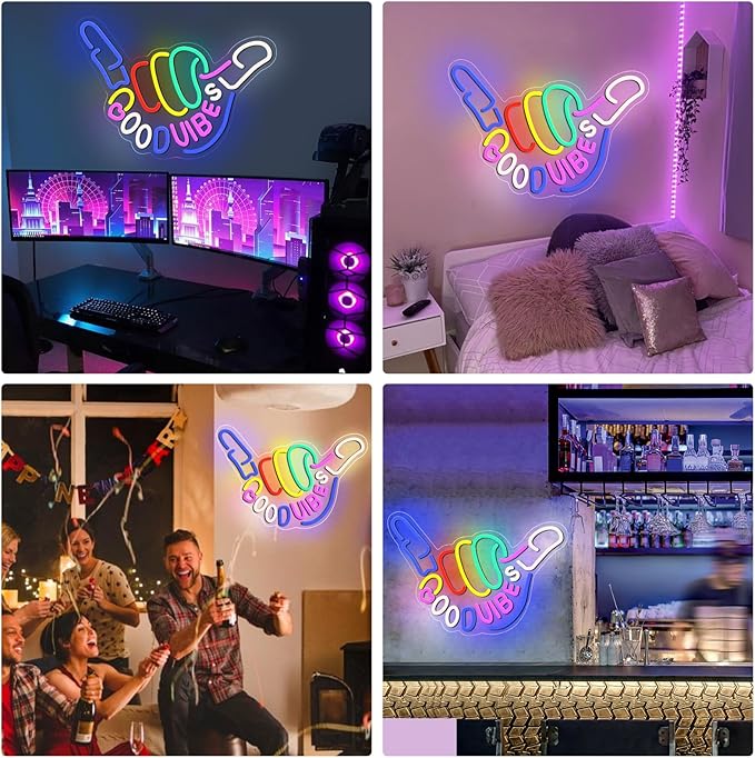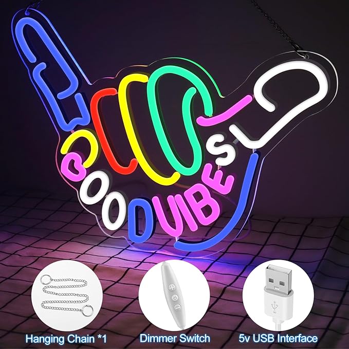 - UNIQUE NEON LIGHT DECOR: The good vibes neon sign is perfect for both indoor and outdoor wall decorations. The creative gesture design, with bright neon colors, instantly creates a great atmosphere and can be used as a party backdrop to add a unique splash of color to any space, making every gathering more vibrant and fun.