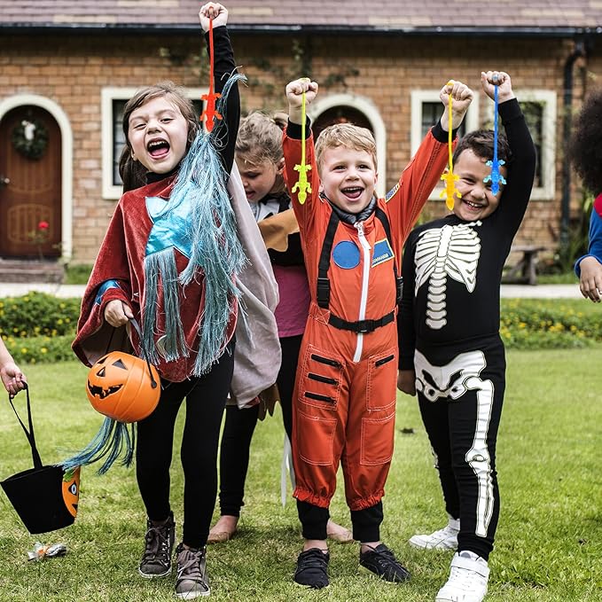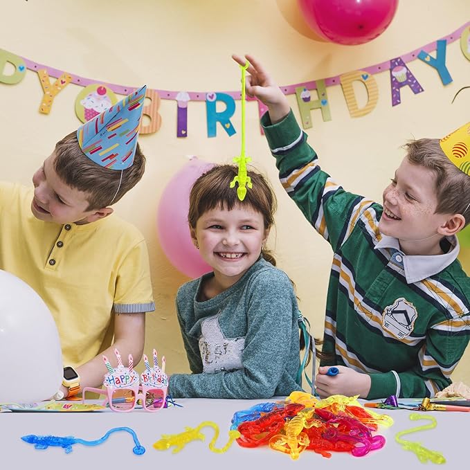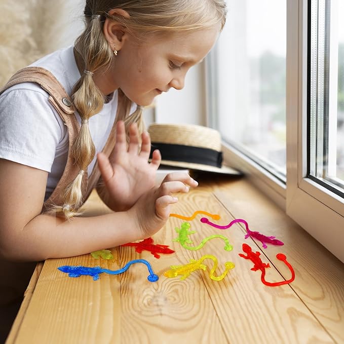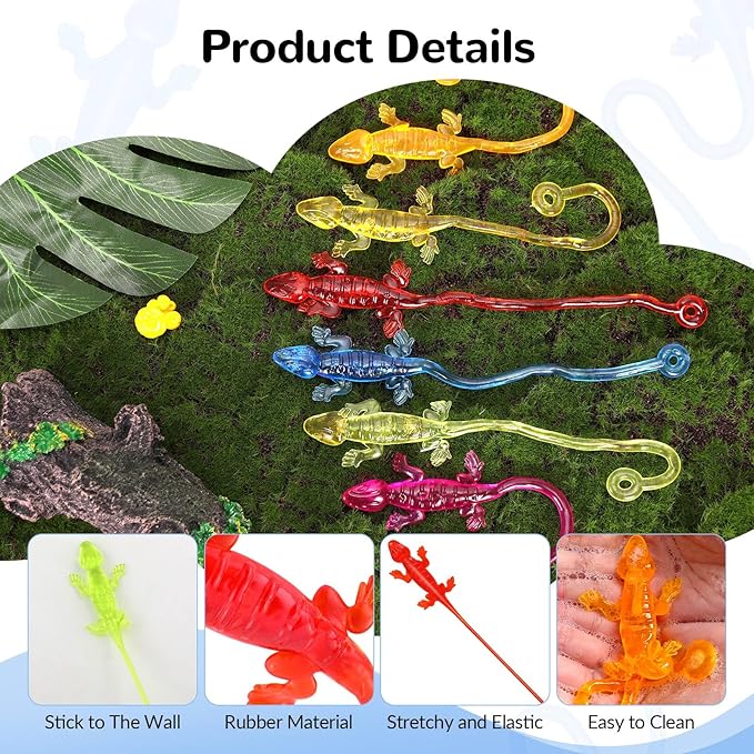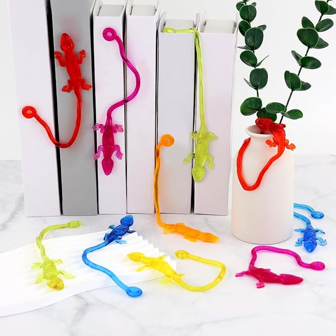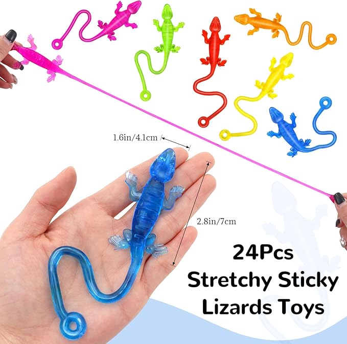 • PACKAGE CONTAINS: 24pcs stretchy sticky lizards with red, blue, purple, orange, green, yellow. (colors are shipped randomly!) Each Lizard is individually packed. Cute and colorful elastic lizard toys can arouse children's curiosity and interest