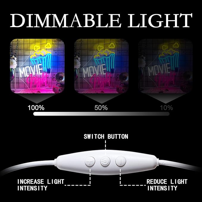 Lucunstar Movie Night With Popcorn Neon Sign, Room Lights for Wall Decor, Dimmable USB Neon Lights for Party, Theater Decor for Home
