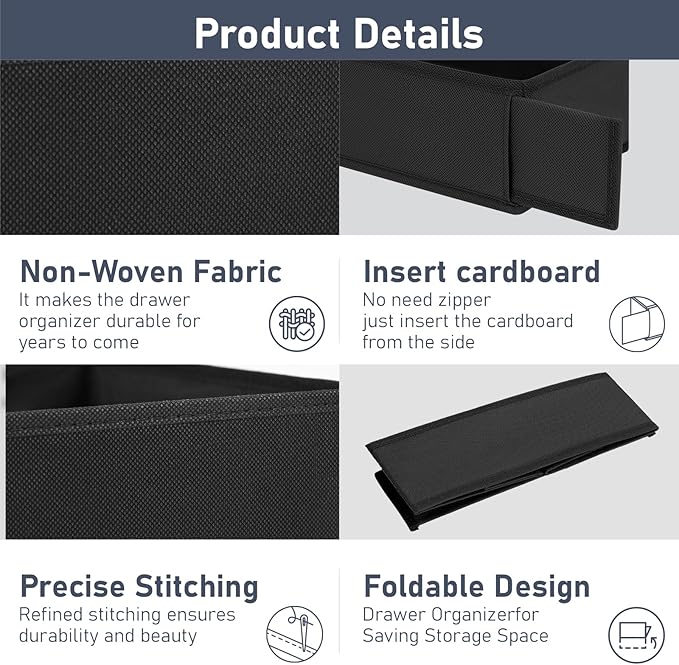 - Side Insert Design Underwear Organizer: The insert-style design eliminates the need for zippers; simply insert the cardboard directly to complete the setup. This avoids potential issues with zippers getting stuck, breaking, or malfunctioning. The side-inserted cardboard design enhances the structural support of the drawer organizer clothes, improving its durability and overall user experience