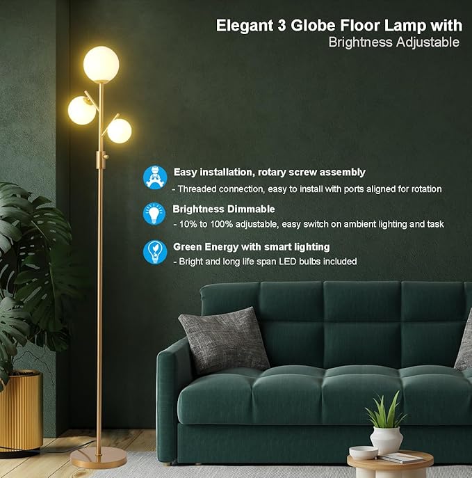 Fiqevs Dimmable Globe Floor Lamp, 3 x 800LM LED Bulbs Included Brightness Adjustable, Mid Century Modern Glass Floor Lamps for Living Room, Gold Standing Tall Lamp for Bedroom Office Dining Room
