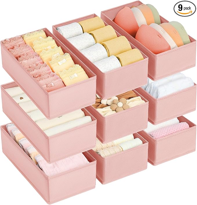 DIMJ Drawer Organizer Clothes - Underwear Organizer Small Sock Organizer Box Dresser Organizer for Baby Clothes,Bra,Socks, Belt, Tie, Set of 9,Pink