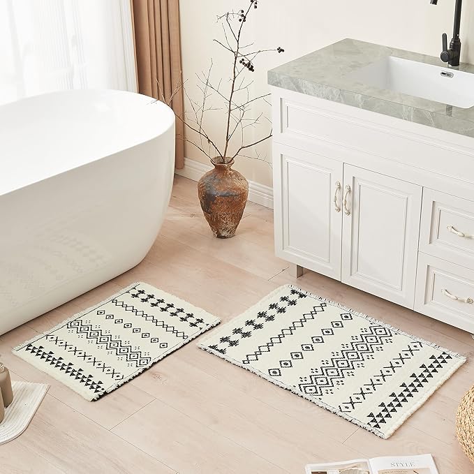 - 【Widely Used】Our bath mats also offer an easy way to update your bathroom. Place them in front of the tub, the toilet or sink — our wide range of sizes and colours makes it easy to find one to fit your space and your style. The Boho bathroom rugs come with different colors and sizes creating a look of elegance to complement your decor. Also, it can be widely used as a bath mat, bathtub mat, bathroom rugs, door mats, bedroom rugs, dog bath mats, and foot bath mats. Wide Versatility. This is a multifunctional rug. Put them in living room to sit, in the entry way to keep the dust away from your house.
