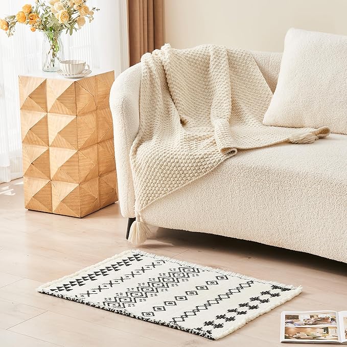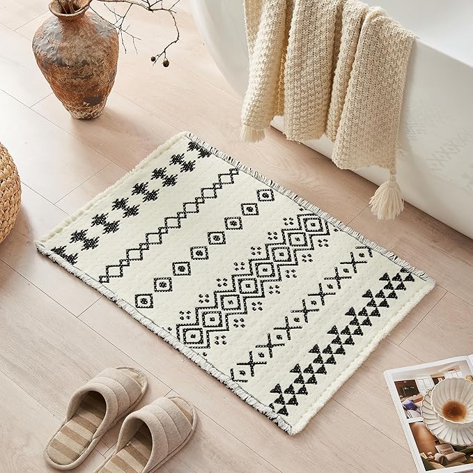 Douceur Boho Bath mat for Bathroom Floor Non Slip, Acrylic Blend Cute Bath Rugs with Tassels, Black and Cream White Tribal Ethnic Pattern Farmhouse Bathroom Rugs, 20" x 32"