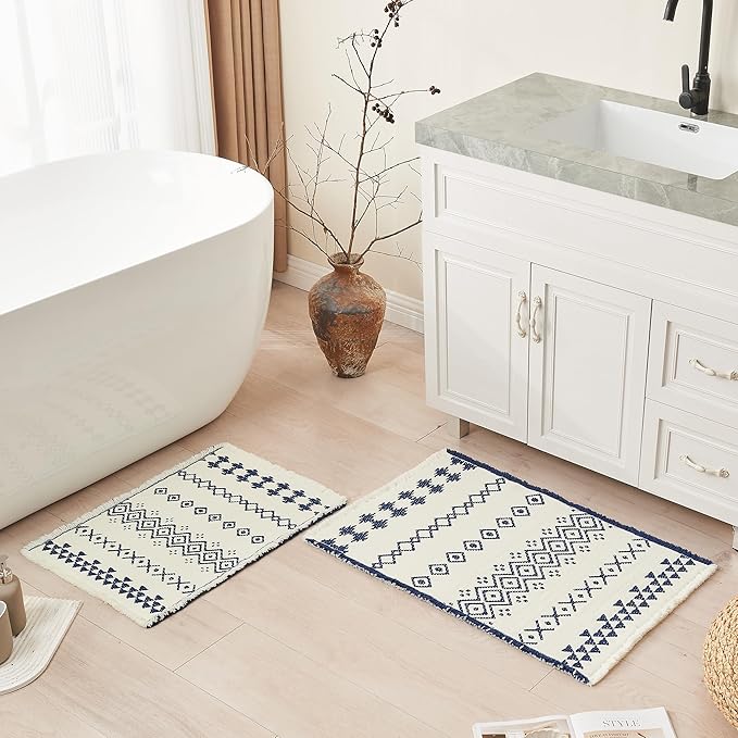 - 【Widely Used】Our bath mats also offer an easy way to update your bathroom. Place them in front of the tub, the toilet or sink — our wide range of sizes and colours makes it easy to find one to fit your space and your style. The Boho bathroom rugs come with different colors and sizes creating a look of elegance to complement your decor. Also, it can be widely used as a bath mat, bathtub mat, bathroom rugs, door mats, bedroom rugs, dog bath mats, and foot bath mats. Wide Versatility. This is a multifunctional rug. Put them in living room to sit, in the entry way to keep the dust away from your house.