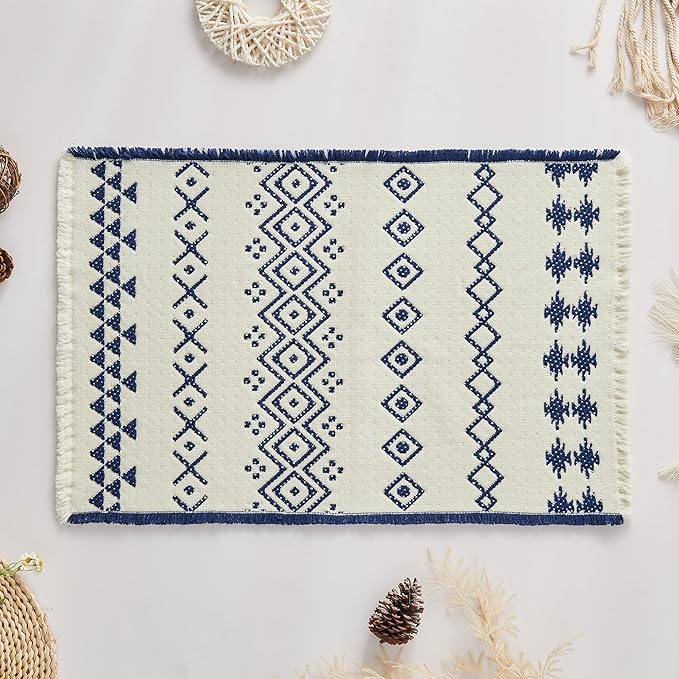 Douceur Boho Bath mat for Bathroom Floor Non Slip, Acrylic Blend Cute Bath Rugs with Tassels, Blue and White Tribal Ethnic Pattern Farmhouse Bathroom Rugs, 24" x 36"