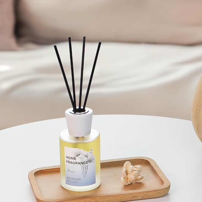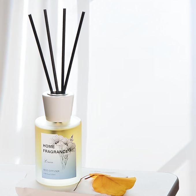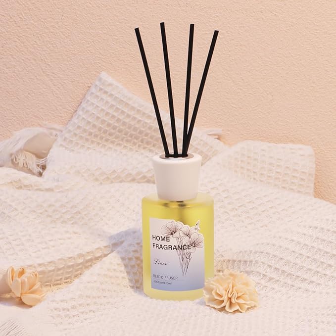 - Includes:One 4.06oz (120ml) clear glass bottles that contains a Linen essential oils and 8 sticks.