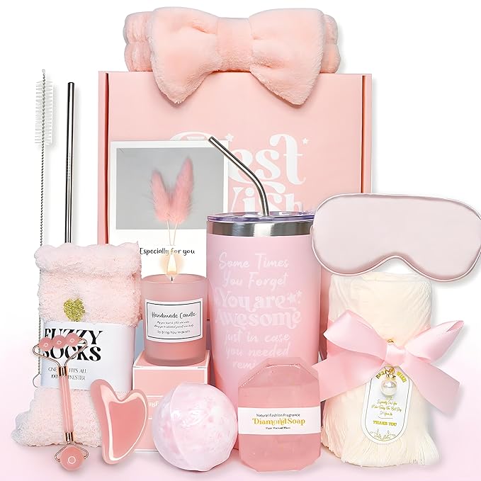 - 【14-piece Gift Basket】This gift set for women includes a 20 OZ stainless steel glass water cup, a straight metal straw, a bent straw, one straw brush, a Gua Sha Facial Tool, a Jade Roller, a pure cotton towel, a pair of plush socks, a therapeutic eye mask, a Bath Bomb, a Bath Salt, an aromatherapy Candle, a pure handmade diamond soap, and a lovely Dried Flower Greeting Card. It’s the perfect bath sets for women gift and an ideal birthday gifts for women that combines relaxation and luxury.