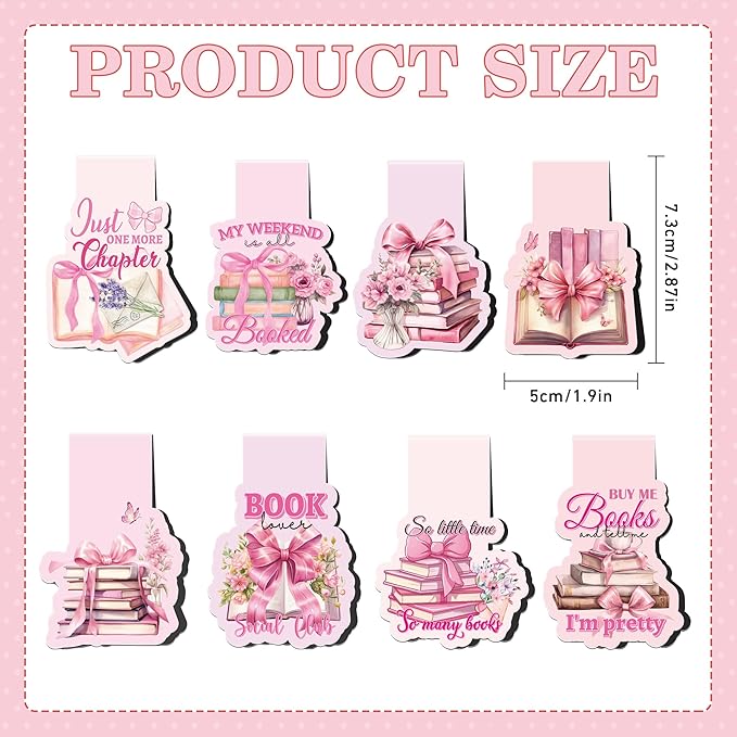- Elegant Coquete Bow Design: These magnetic bookmarks feature charming pink bow designs, adding a touch of sweetness and style to your reading experience, making each book page special
