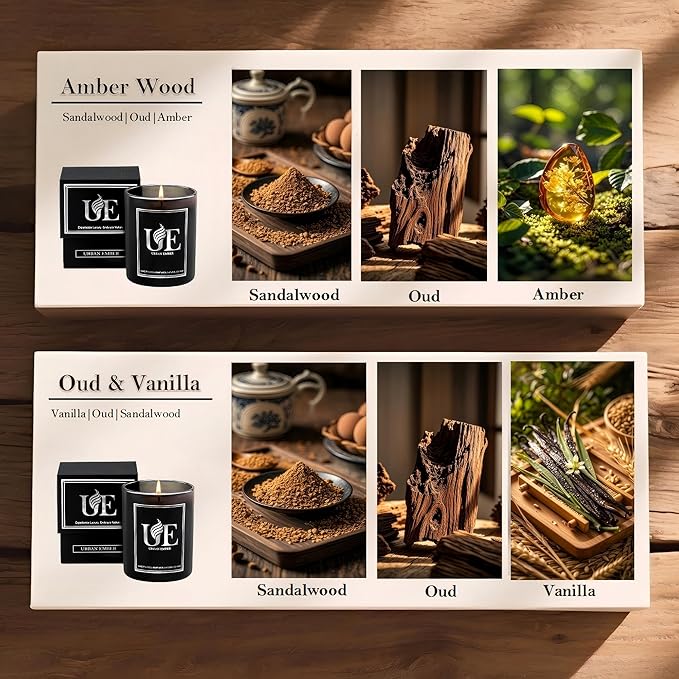 - Amber Wood and Wood & Leather fragrances in scented candles evoke a richly layered scent profile that blends warmth, depth, and earthy sophistication. Amber Wood typically combines the resinous, slightly sweet nuances of amber with smoky, woody undertones like sandalwood or cedar, creating a cozy yet refined ambiance. Wood & Leather harmonizes rugged, masculine notes—think aged oak, smoky vetiver, or birch—with the supple, smoky essence of tanned leather, offering a bold, grounding aroma. Together, these fragrances balance sweetness with smokiness, softness with ruggedness, evoking a sense of timeless elegance and natural comfort.
