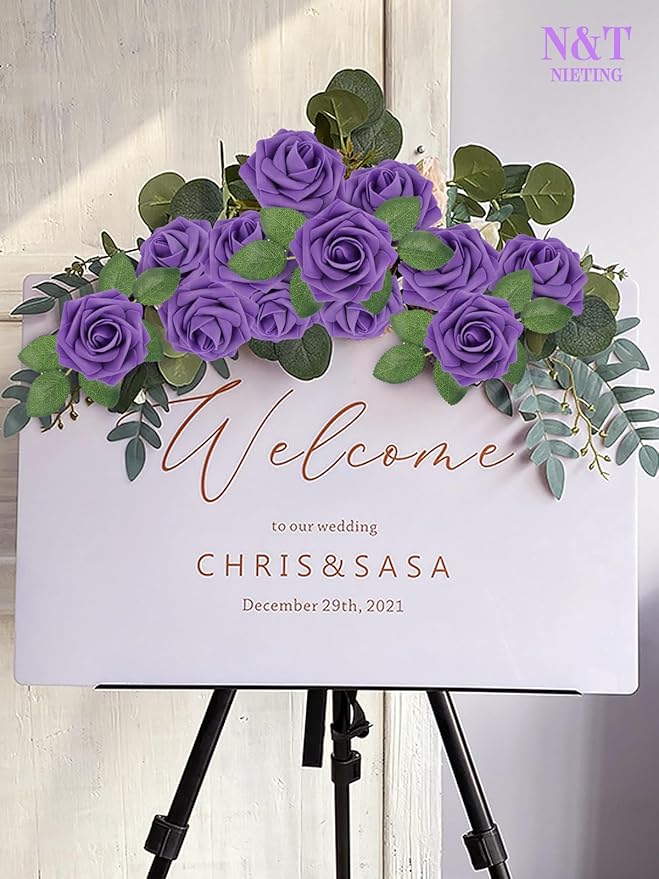 N&T NIETING Fake Flowers Purple Roses, 50Pcs Artificial Flowers Foam Roses with Stems for DIY Wedding Bridesmaid Bridal Bouquets Centerpieces Party Home Decoration Baby Showe
