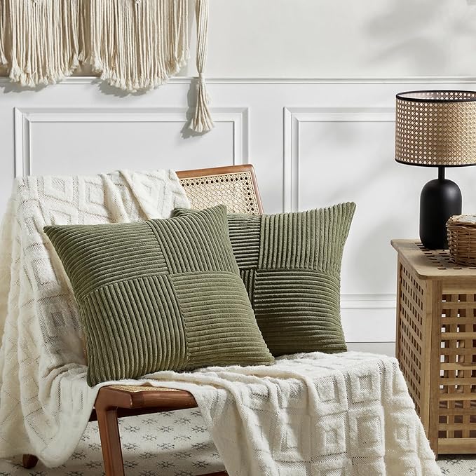 Fancy Homi 2 Packs Olive Green Euro Decorative Throw Pillow Covers 28x28 Inch Room Couch Bed, Rustic Farmhouse Boho Home Decor, Soft Corss Corduroy Patchwork Textured Cushion Case 71x71 cm