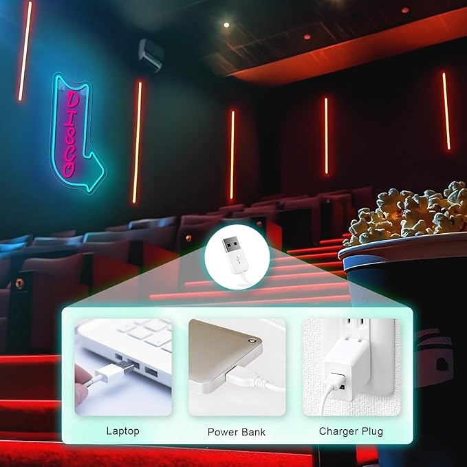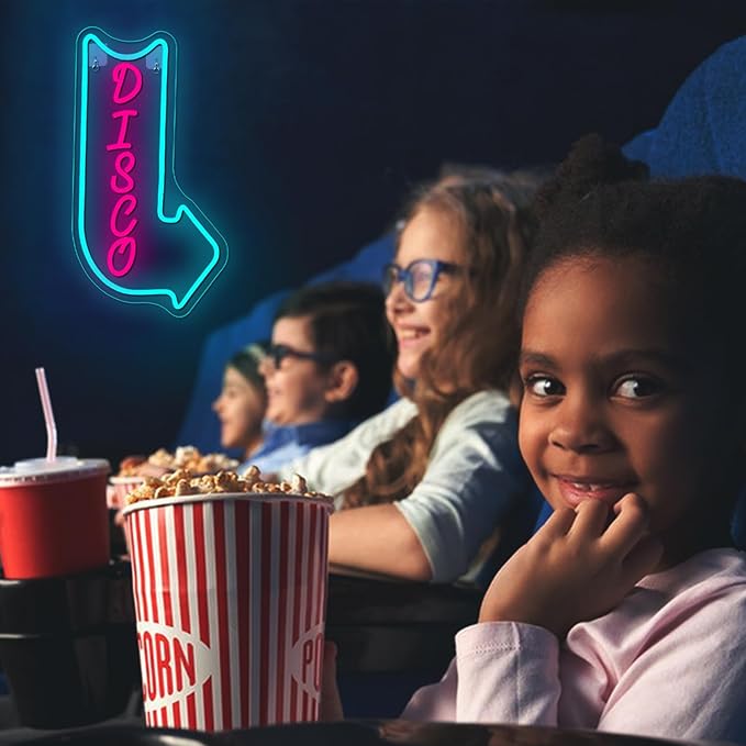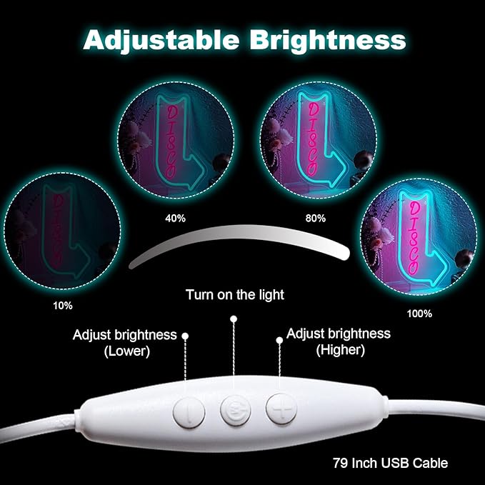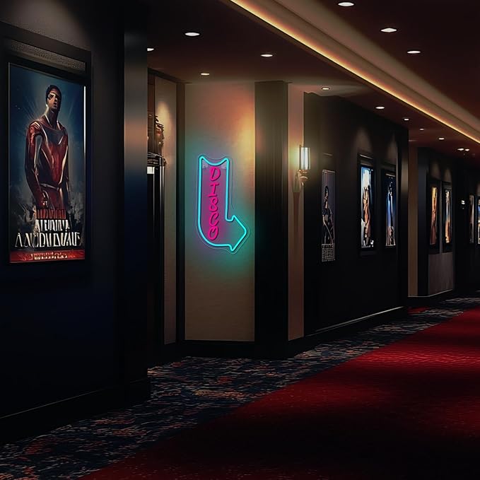 - Vivid LED Colors for Maximum Impact: The disco neon light combines electric blue and neon pink LED lights to create a visually exciting contrast. The blue arrow and pink "DISCO" text stand out, making it an eye-catching focal point for any room or event.