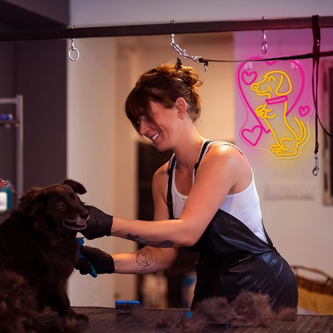 - 【Dog Neon Sign】: This anime neon sign features a very unique design pattern of dogs and hearts, using yellow and pink neon tubes. It is very suitable as a wall decoration for bedrooms, living rooms, bars, game rooms, gatherings, and other places.