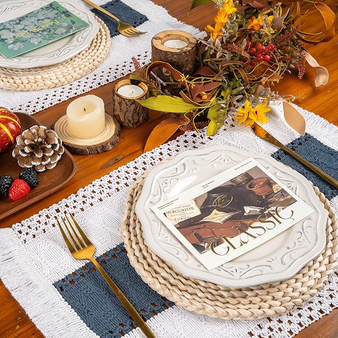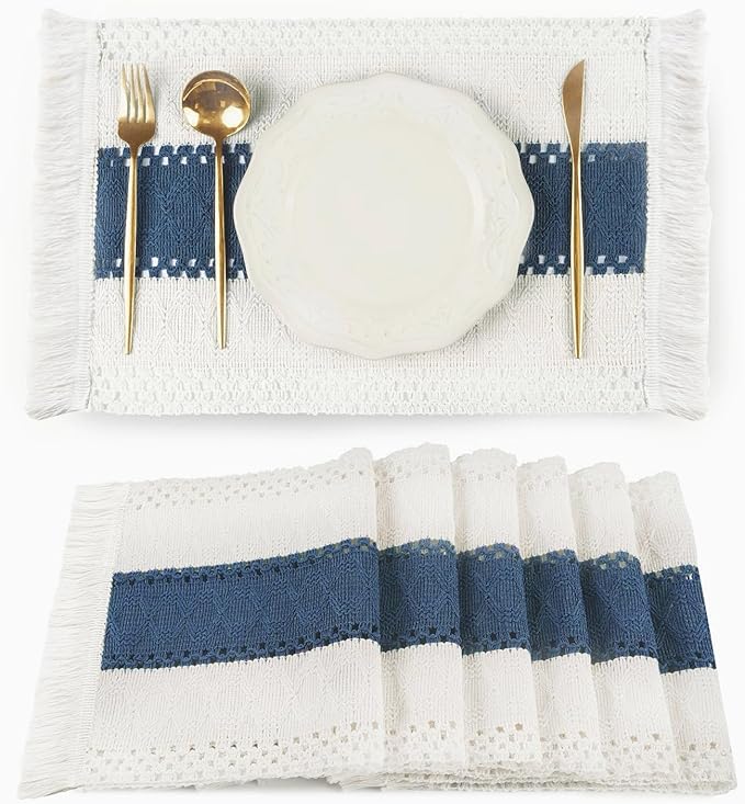 FEXIA Blue Boho Placemats Set of 6, Macrame Table Decor and Farmhouse Style Placemats Natural Cotton Burlap, for Dining Table, Blue