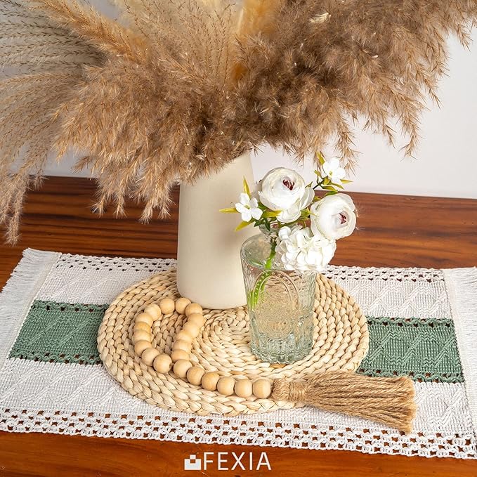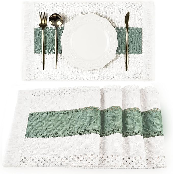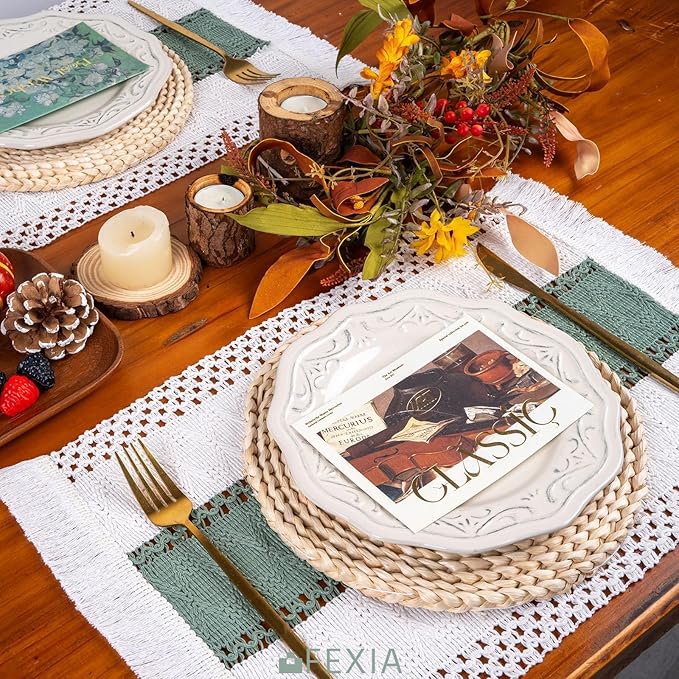 FEXIA Sage Green Boho Placemats Set of 4, Macrame Table Decor and Farmhouse Style Placemats Natural Cotton Burlap, for Dining Table