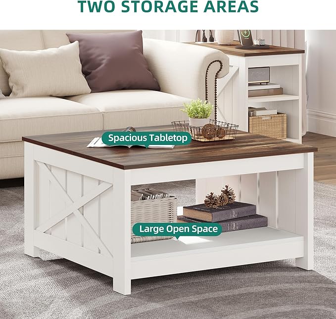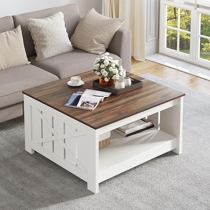 YITAHOME Coffee Table Farmhouse Coffee Table with Storage Rustic Wood Cocktail Table, Square Coffee Tables for Living Meeting Room with Half Open Storage Compartment, Brown with White