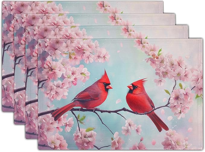 Giwawa Spring Birds Placemats Set of 4-12x18 Inch Red Bird Cherry Blossom Floral Place Mat- Stain Heat Resistant Linen Table Mats for Kitchen Dining Tabletop Seasonal Party Indoor Outdoor Decor
