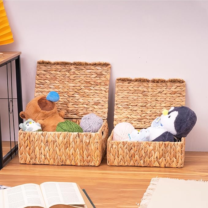 - 🎯 【Durable Material】: Wicker basket with lid is made of natural water hyacinth, so they may vary slightly in shape. Designed with a unique weave edge scalloped, these woven baskets are an irresistible piece to coordinate with your furniture. The lids open and close easily and prevent dust from settling on the stored contents.