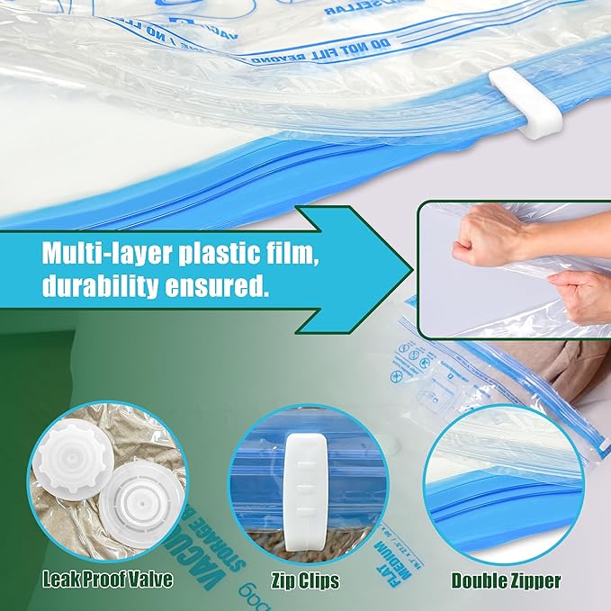 - These vacuum storage bags are both durable and reusable, as they're made of extra-thick rip-resistant PA+PE material. Additionally, they feature a stay-on clip that helps to ensure the bag remains secure during the sealing process, making it quicker and easier.