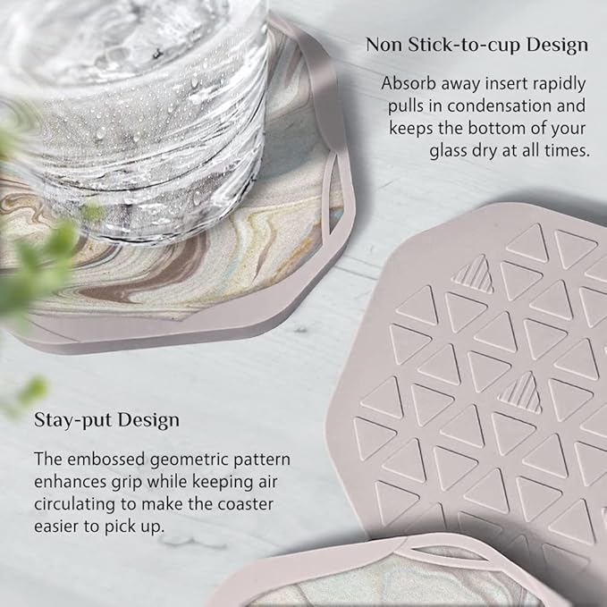 - FUNCTIONALITY - Avoid condensation rings, drips and puddles on tabletop; Prevent sticking, sliding, skidding and leaving marks or stains; Reduce excess noise for a quieter; Non-breakable, reusable, and washable; Protect counters, wooden desks, bedside furniture, nightstands in your apartment or house from scratches; Slip resistant on various surfaces like countertop or desktop which made of marble, stone, slate, ceramic, leather, agate, sandstone, geode, rubber, plastic, cork, or bamboo